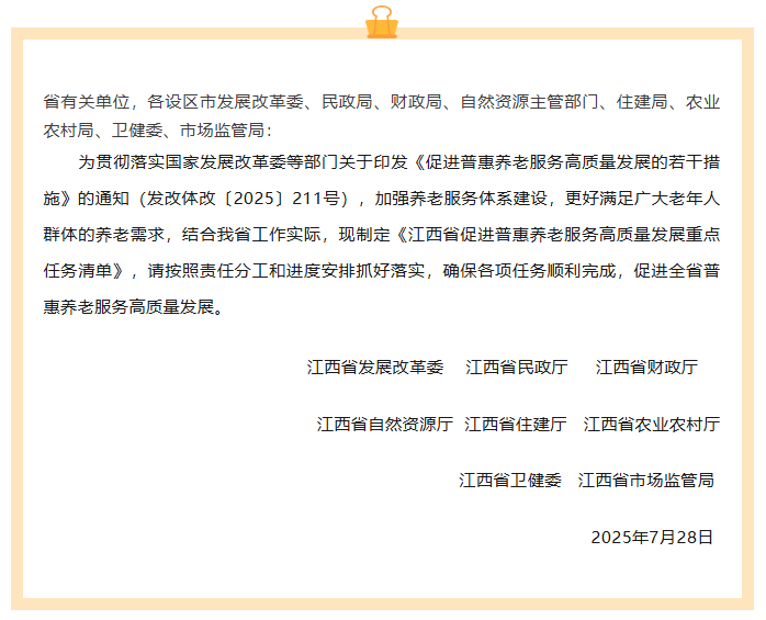 江西省促进普惠养老服务高质量发展重点任务清单