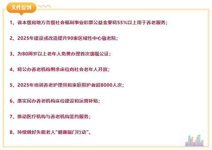 8 | 开放养老服务市场,支持各类经营主体依法参与普惠养老服务,鼓励社会力量兴建连锁化、集团化普惠支持型养老服务机构。 | 省民政厅 | 2025年底前取得阶段性成效并长期坚持 |